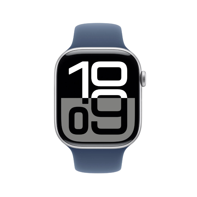 • ساعة Apple Watch Series 10 مقاس 46 مم – هيكل ألومنيوم فضي (Jet Silver) مع سوار Denim.