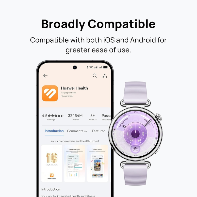 تعمل مع Android وiOS عبر تطبيق HUAWEI Health، مع أفضل تكامل على هواتف هواوي، لكن معظم مزايا التتبع والرياضة متاحة على الكل.