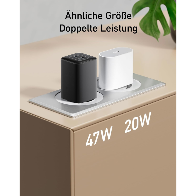 يدعم خرج إجمالي 47W عبر منفذين USB‑C؛ عند استخدام المنفذين معًا يعطي تقريبًا 27W من منفذ و20W من المنفذ الآخر، ما يسمح بشحن موبايل (آيفون 15 مثلاً) وآيباد أو تابلت في نفس الوقت بسرعات عالية.