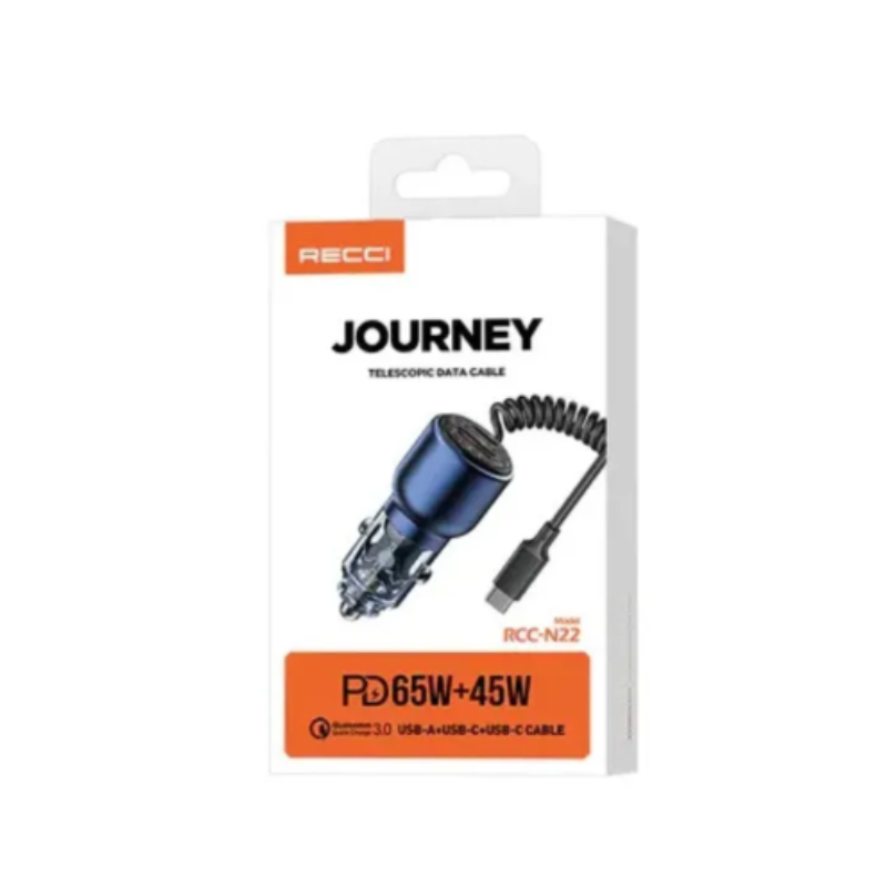 يتميز شاحن سيارة RECCI Journey 65W RCC-N22 بشحن مزدوج فائق السرعة (USB-C PD 65 واط + USB-A 45 واط) مع إجمالي 110 واط لشحن جهازين متزامنًا، مثالي لهواتف إنفينيكس وسامسونج والابتوبات الخفيفة. كابل Type-C مدمج زنبركي بطول 1.8 متر قابل للتمدد يوفر مرونة كاملة في السيارة، مع هيكل ألمنيوم + بلاستيك شفاف أنيق محفور بلغو RECCI. حماية شاملة من التيار الزائد والجهد والحرارة والقصر مع رقاقة ذكية تحافظ على استقرار التيار.