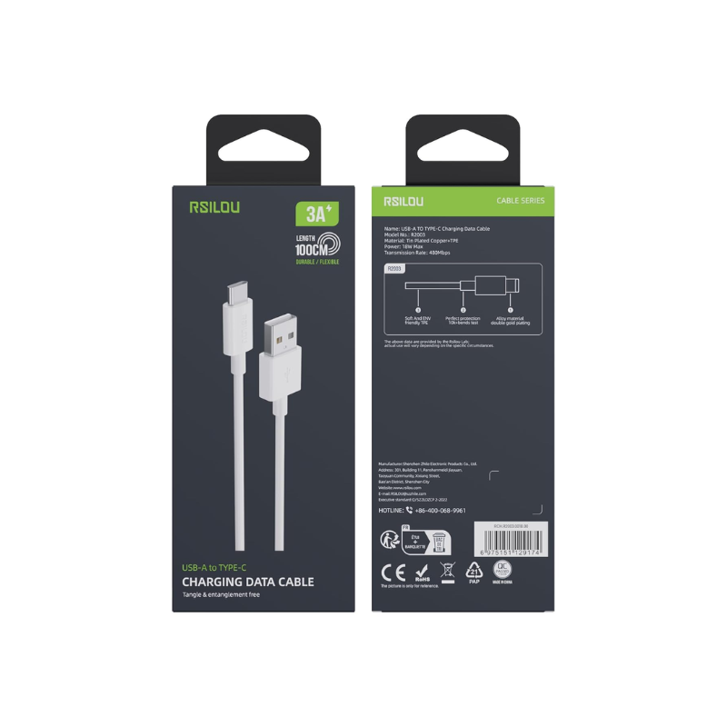 Rsilou Cable USB to Type-C 3A موديل R2003-001 بطول 1 متر هو كابل احترافي من Rsilou يوفر شحناً سريعاً جداً وآمناً بتيار 3A عالي لنقل البيانات والشحن السريع. الكابل مصنوع من مواد عالية الجودة والقوة جداً (ألياف نايلون معززة وحماية حرارية متقدمة) توفر متانة عالية جداً وحماية كاملة من التلف والكسر. يدعم معيار شحن آمن وسريع يوفر شحناً ذكياً وسريعاً جداً للهواتف والأجهزة المختلفة بكفاءة عالية جداً. تيار 3A قوي جداً توفر شحناً سريعاً جداً وكافياً للهواتف والأجهزة الخفيفة والمتوسطة بدون مشاكل أو بطء. طول الكابل 1 متر يوفر مرونة عملية وسهلة الاستخدام في المنزل والمكتب والتنقل. سرعة نقل البيانات العالية توفر نقل الملفات والبيانات بسرعة عالية جداً وموثوقة تماماً. التوصيل الآمن والموثوق يوفر اتصالاً قوياً وآمناً بدون انقطاع أو مشاكل في النقل والشحن. حماية متقدمة من الضغط الزائد والقصور والحرارة توفر أماناً عالياً جداً للأجهزة الثمينة. تصميم أنيق وحديث يعطي مظهراً احترافياً وعملياً وجميل جداً. مرن وسهل الاستخدام والحمل والتنقل مع الأجهزة بسهولة وراحة عالية. متوافق تماماً مع جميع الهواتف والأجهزة التي تدعم منفذ USB Type-C.