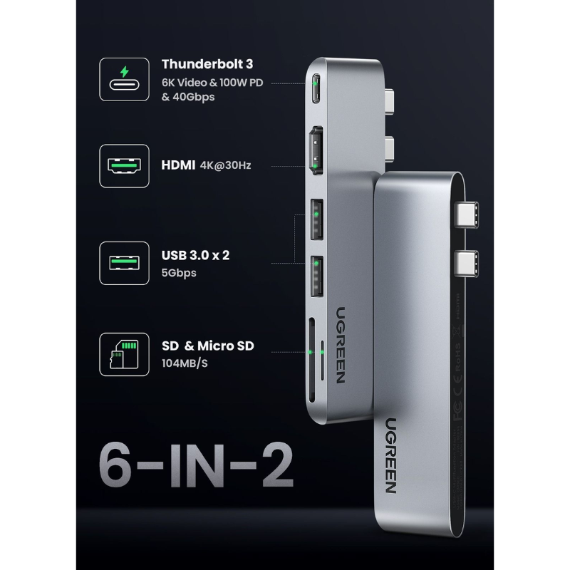 هَب UGREEN 80856 6‑in‑2 USB‑C Hub for MacBook Pro/Air (يركب في منفذين USB‑C متجاورين).